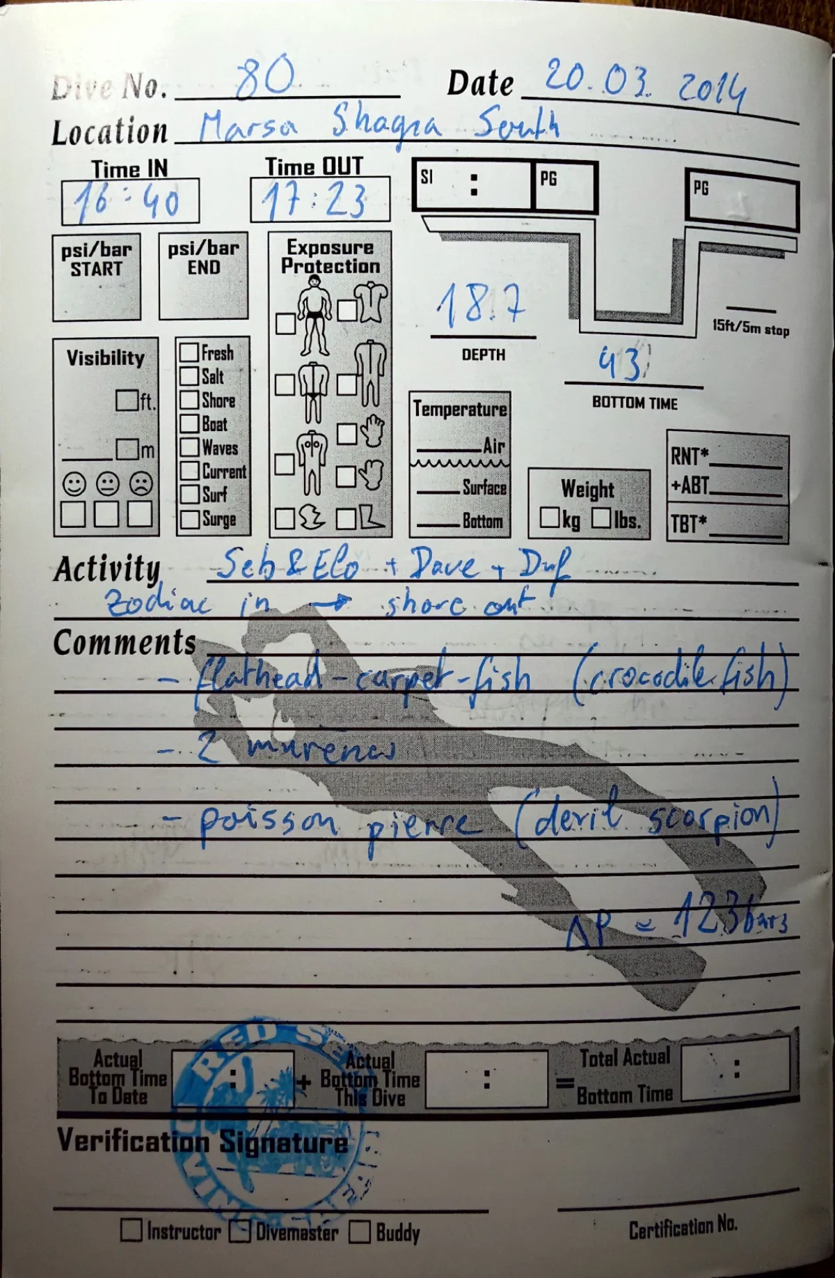 Plongée #80 — Marsa Shagra SudMarsa Shagra 20 mars 2014🕐 16:40 ⏱ 43 min ↓ 18.7 m 🫧 123 bar bateauAvec Seb + Elo + Dave + DufZodiac in, shore out. Flathead carpet fish (crocodile fish), 2 murenes, poisson pierre (devil scorpion)Page du carnet