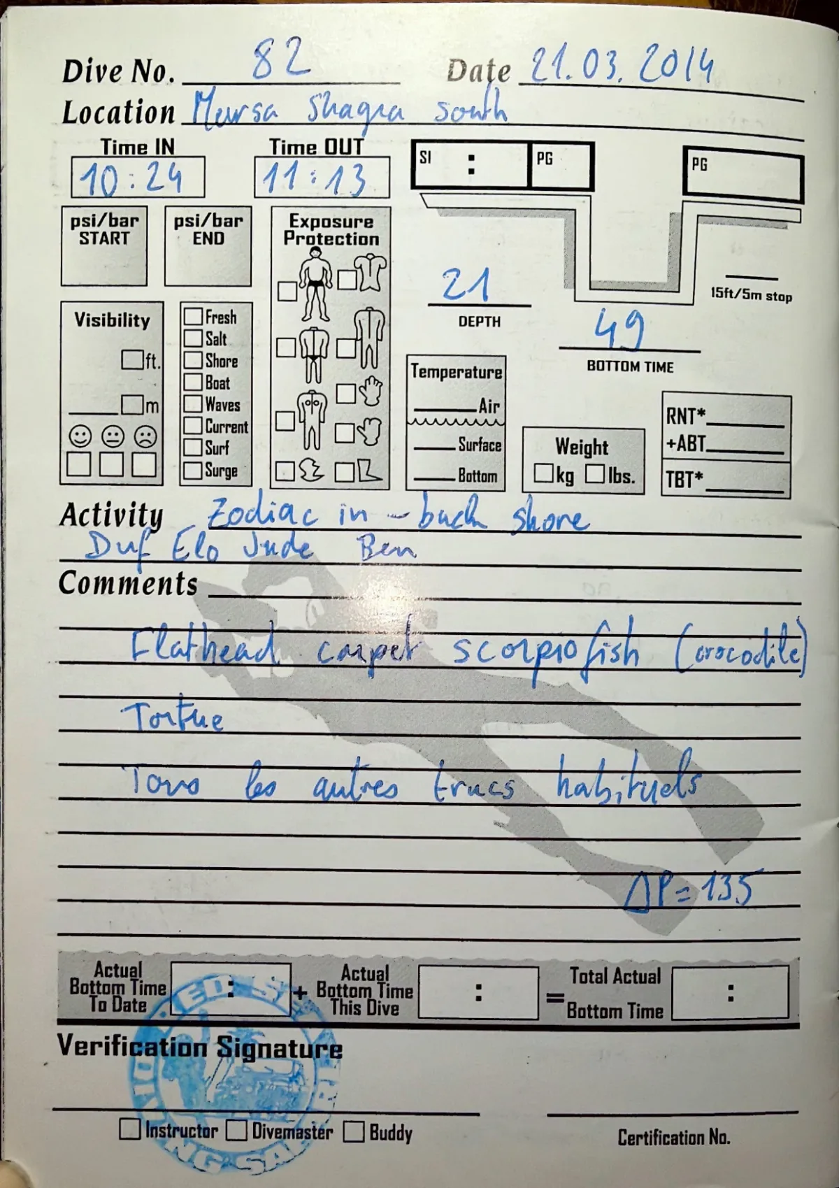 Plongée #82 — Marsa Shagra SudMarsa Shagra 21 mars 2014🕐 10:24 ⏱ 49 min ↓ 21 m 🫧 135 bar bateauAvec Duf + Elo + Jude + BenZodiac in, back shore. Flathead carpet scorpiofish (crocodile), tortue. Tous les autres trucs habituelsPage du carnet