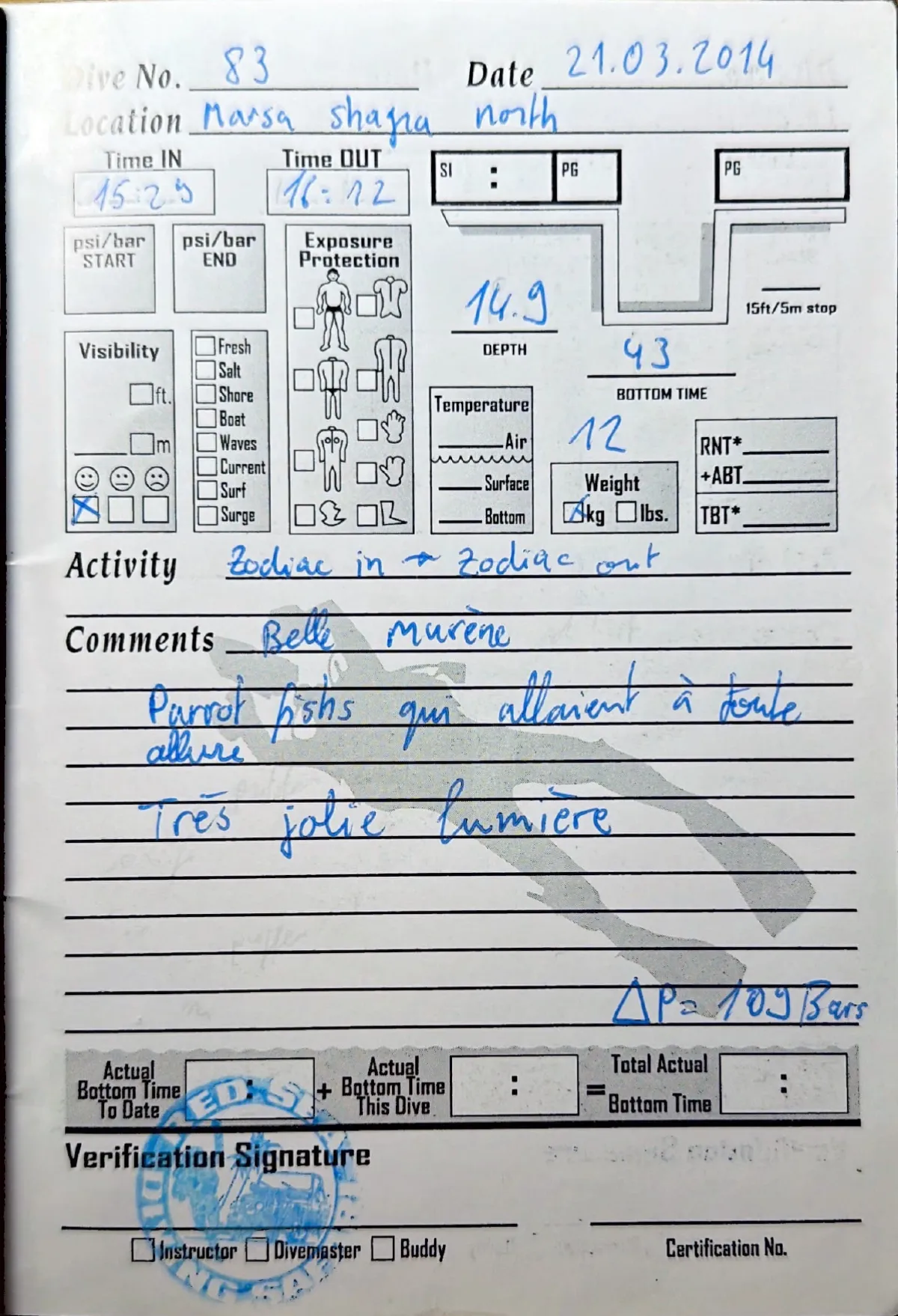 Plongée #83 — Marsa Shagra NordMarsa Shagra 21 mars 2014🕐 15:25 ⏱ 43 min ↓ 14.9 m 🌡 12°C 🫧 109 bar ⚖ 12 kg bateauZodiac in, zodiac out. Belle murene, parrot fish qui allaient a toute allure. Tres jolie lumierePage du carnet