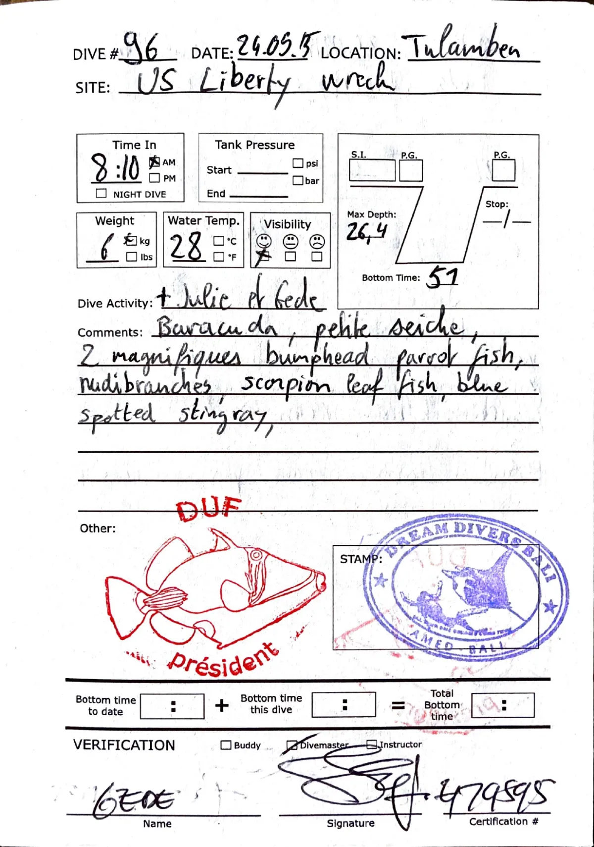 Plongée #96 — Liberty WreckTulamben 13 septembre 2015🕐 08:25 ⏱ 56 min ↓ 28.6 m 🌡 28°C ⚖ 6 kg rivageAvec DufLiberty wreck. Bumphead parrot fish, sweetlips, barracuda, tortue, nudibranchesPage du carnet
